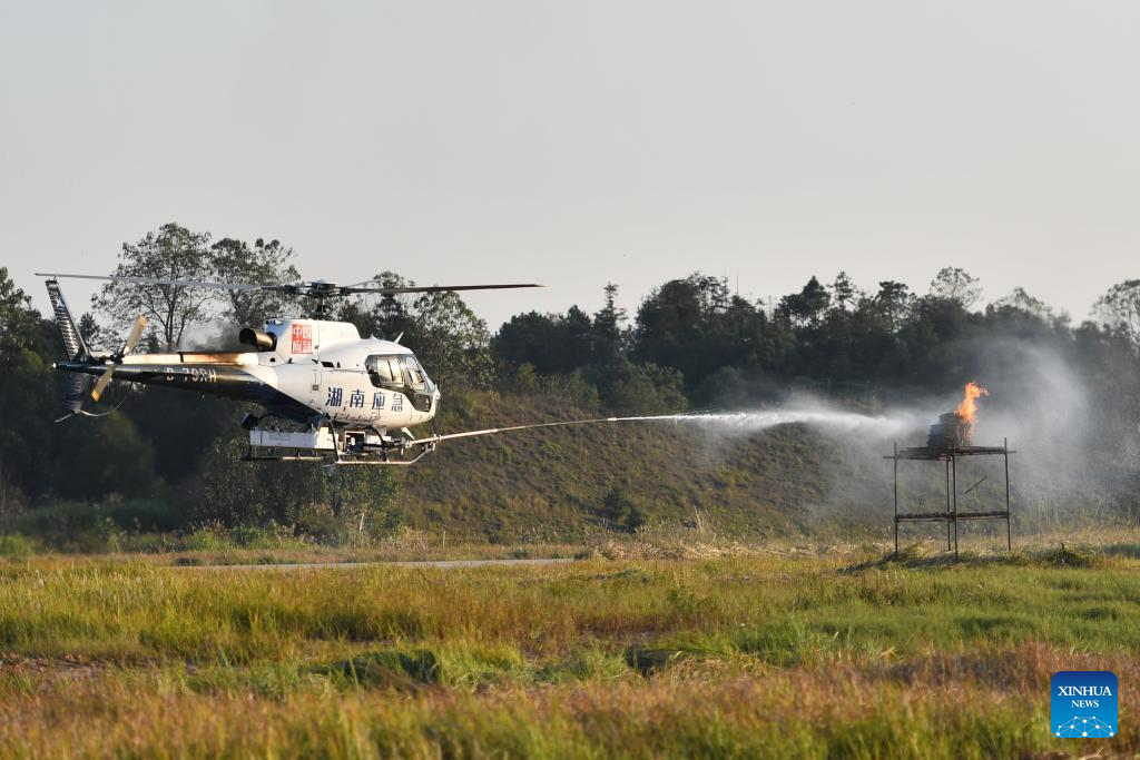 Un helicóptero realiza un simulacro de incendio durante la Exposición Internacional de la Industria de la Aviación General y la Economía de Baja Altitud de Hunan 2025 en el Aeropuerto de Lusong, en la ciudad de Zhuzhou, en la provincia de Hunan, en el centro de China, el 21 de noviembre de 2025. La exposición consta de una exhibición estática en el Centro Internacional de Convenciones y Exposiciones de Changsha y un espectáculo aéreo en el Aeropuerto de Lusong de la ciudad de Zhuzhou, ambos en la provincia de Hunan, en el centro de China. (Xinhua/Chen Zhenhai)