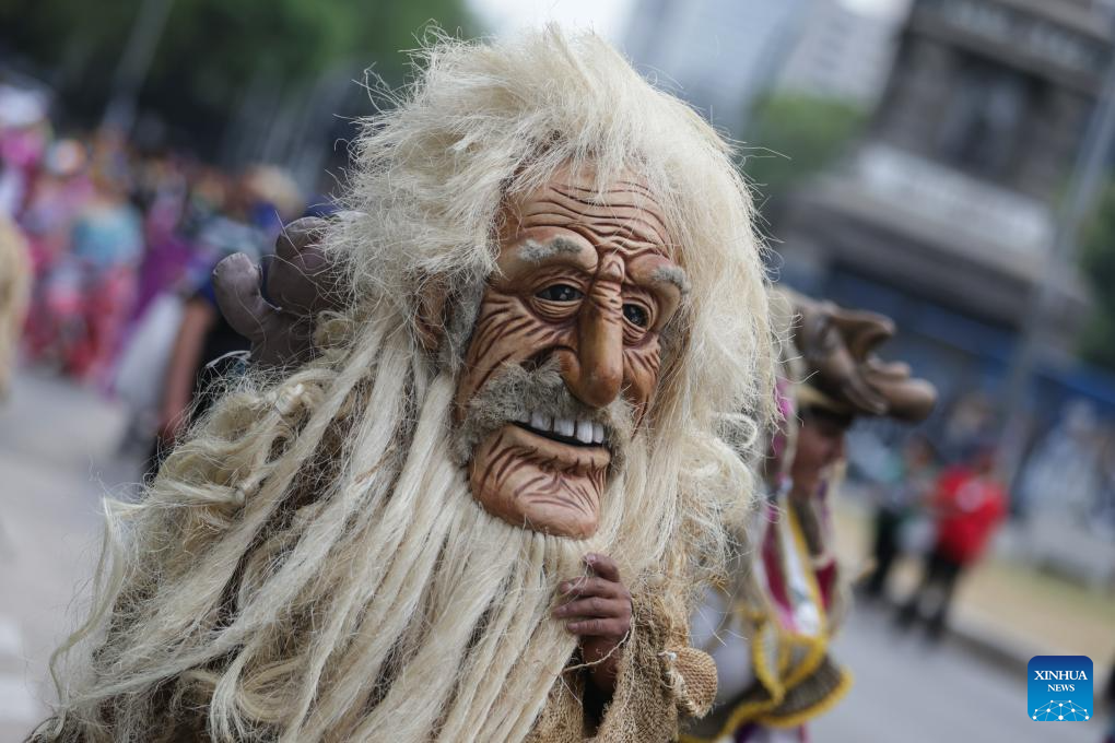 Un artista disfrazado es fotografiado durante el Carnaval de Villa-Zapata en la Ciudad de México, el 6 de diciembre de 2025. (Foto de Francisco Ca?edo/Xinhua).