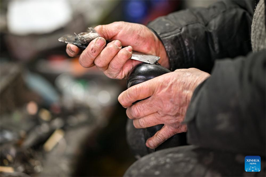 Un zapatero repara un zapato en una tienda del ?callejón de las reparaciones? en Tianjin, norte de China, el 9 de diciembre de 2025. (Xinhua/Zhang Cheng).