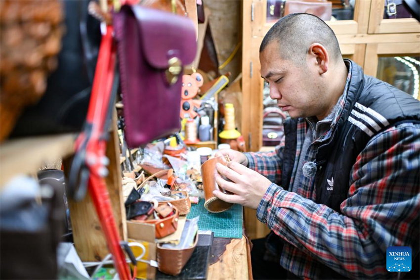 Un comerciante elabora artículos de cuero en una tienda del ?callejón de las reparaciones? en Tianjin, norte de China, el 9 de diciembre de 2025. (Xinhua/Zhang Cheng).